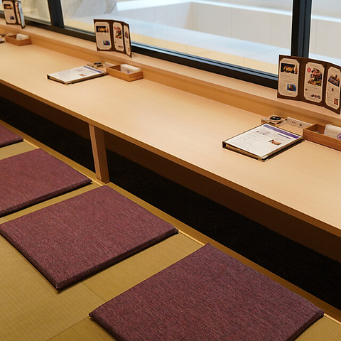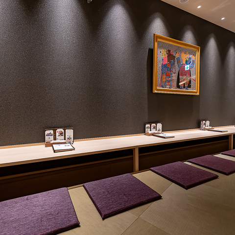 カウンター席にも、足を伸ばしてゆったりとお寛ぎいただける掘りごたつスタイルを採用。柔らかな畳の感触と程よい厚みの座布団が、長居したくなるような心地よさを提供します。カウンターならではの程よいライブ感を感じつつも、プライベートなひとときを過ごせる、現代的な和のスタイルをご提案いたします。