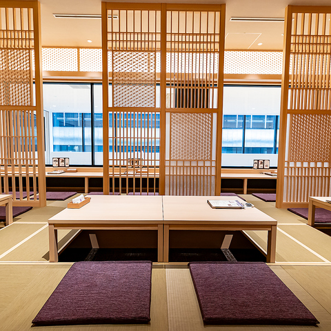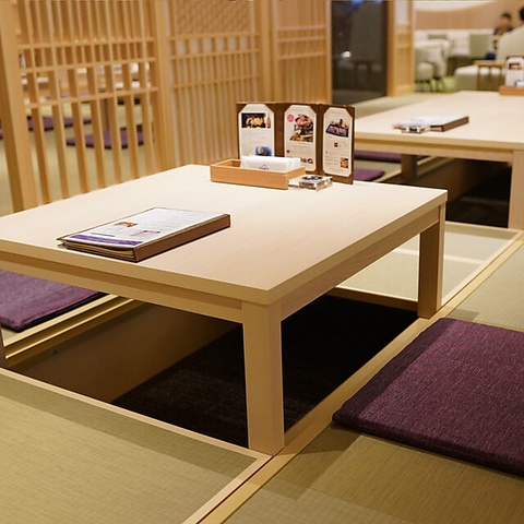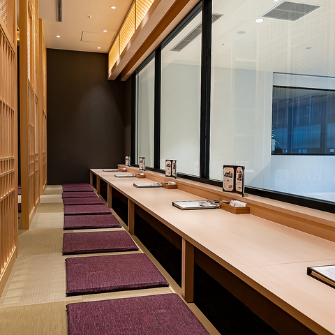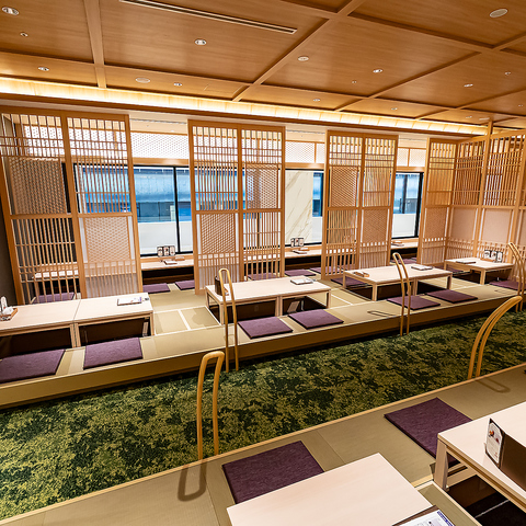 足を伸ばしてゆったりとお寛ぎいただける掘りごたつ式を採用しております。組子の仕切りによって程よくプライベート感があるため、周りを気にせずにお食事や会話をお楽しみいただけるのが魅力です。また、お席への出入りをサポートする手すりを設置するなど、おもてなしの心を大切にしております。