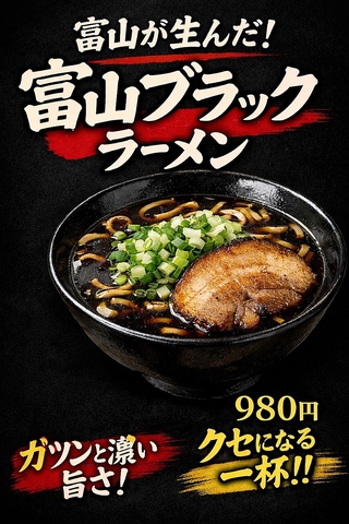 富山名物の味をそのままに仕上げた富山ブラックラーメン。濃口醤油のコク深いスープに、キレのある後味。飲んだ後の〆にも、がっつり一杯にも満足の一杯。980円でご提供。
