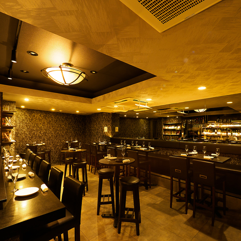壁一面に並ぶボトルと洗練されたバーカウンターが、大人の時間を演出。サク飲みからパーティー利用まで幅広く対応し、飲み放題付きの貸切プランも相談可能です。料理付き・単品利用など柔軟に調整できるので、まずは気軽にご相談ください。