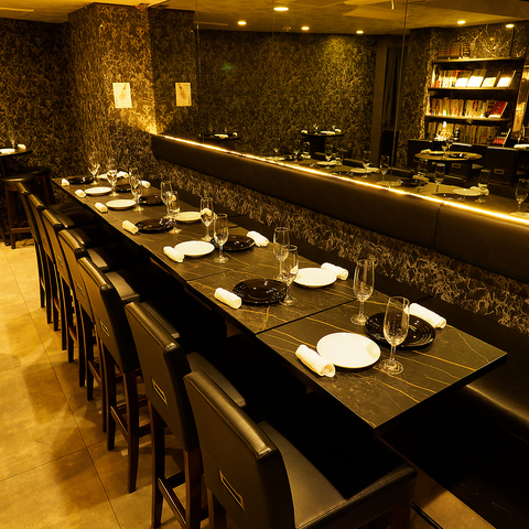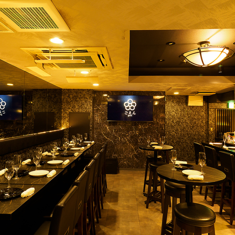重厚感ある大理石調の内装と、温かみのある照明が印象的な大人の空間。テーブル席とバーカウンターを備え、少人数から貸切パーティーまで柔軟に対応可能です。15名から貸切相談OK、料理付き・飲み放題プランもご用意。まずは0円相談から。