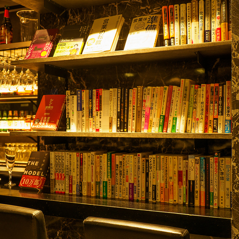 バックバー周辺には、ビジネス書や教養書を中心にセレクトした書棚を設置。お酒を楽しみながら自然と会話が広がる、落ち着いた大人のバーらしい空間演出も魅力のひとつです。