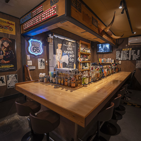 創業50年の歴史を感じさせるビンテージな雰囲気に、職人技が光る一点物の木製家具が調和しています◎木の質感を肌で感じられる椅子に腰掛ければ、まるでお気に入りの書斎にいるような安心感。暗めの照明が落ち着いた夜を演出し、音楽を聴きながらゆったりとお酒を嗜むのに最適な空間です。