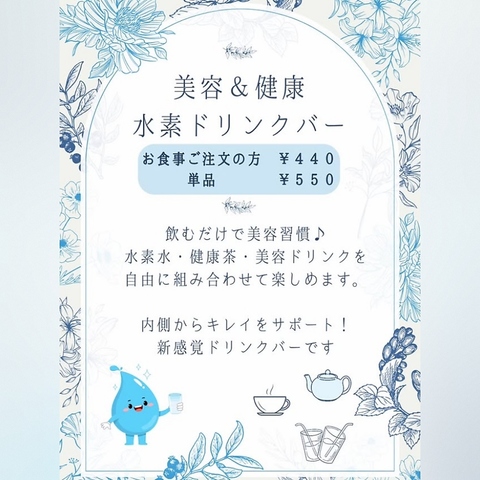 美容&健康に◎水素ドリンクバー始めました!水素水・健康茶・美容ドリンクを自由に組み合わせて楽しめます