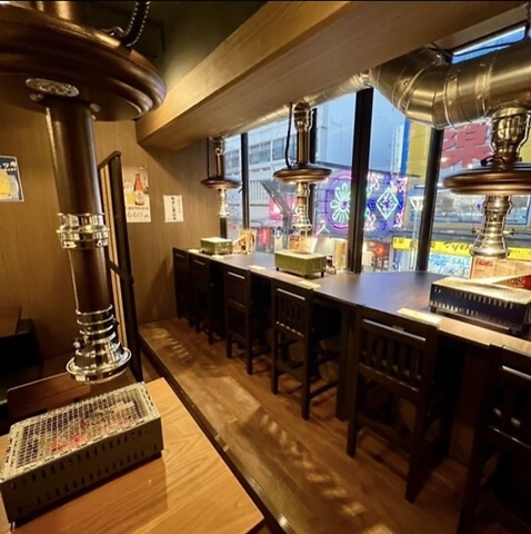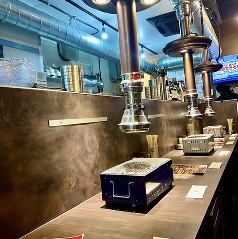 【1Fカウンター席】仕事帰りのサク飲みや一人焼肉に最適!スタッフとの距離も近く、活気ある空間で自慢のお肉を心ゆくまでご堪能ください!