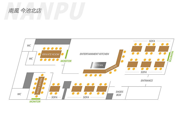 | お店の特長 | お店サイズ:~80席、客層:男女半々、1組当たり人数:~9人、来店ピーク時間:~21時 |