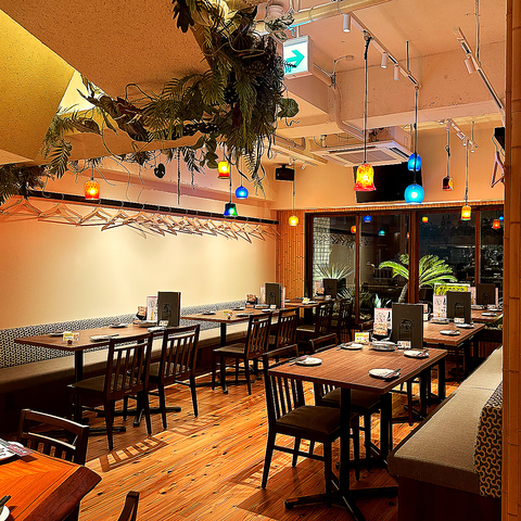 天井いっぱいに広がる緑に包まれる完全個室『ヤンバルの間』!揺れるグリーンとあたたかな灯りが、特別な時間をやさしく包み込みます!テレビも備え、スポーツ観戦やモニター利用にもお使いいただけます!