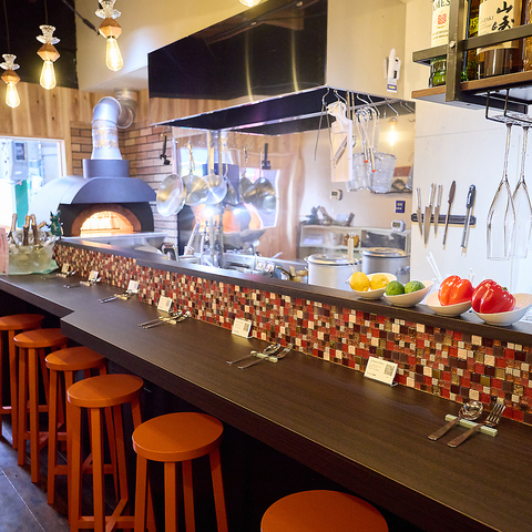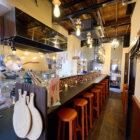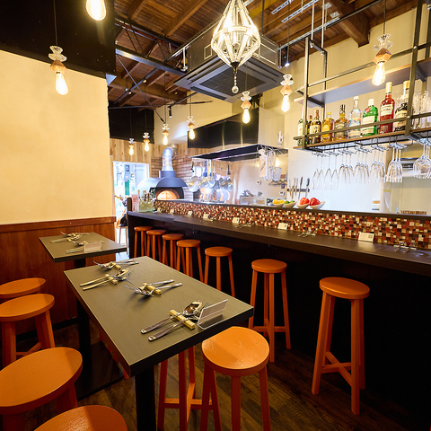 開放感たっぷりのカジュアルな店内です。気取らずにフラリと立ち寄れる親しみやすさが自慢で、お一人様でも気兼ねなく過ごせるカウンターから、テーブル席まで完備。石窯がある本格的な設えながら、雰囲気はどこまでも明るい「天満流」の自由なスタイルが似合う空間です。ぜひ気軽にお立ち寄りください。