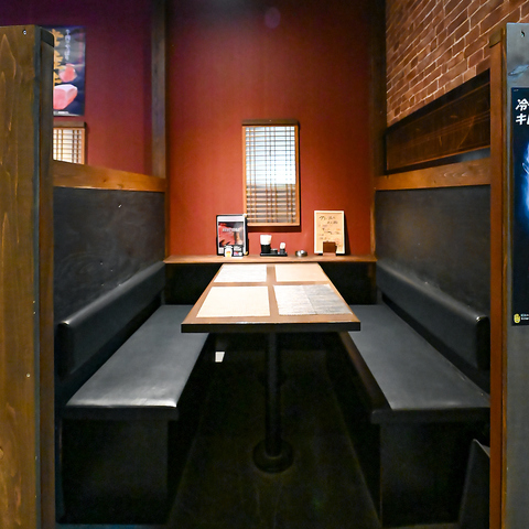 赤と黒のコントラストが印象的な半個室席 。座り心地の良いソファータイプで、適度に仕切られているためプライベート感も抜群です 。