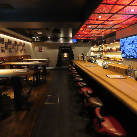 赤を基調とした印象的な天井デザインが目を引く、非日常感のある和モダン空間。木の温もりを感じる長いカウンターが店の中心にあり、一人でも自然に腰を落ち着けられる雰囲気です。照明は程よく落とされ、大人の隠れ家のような落ち着きと遊び心が共存。豊富に並ぶお酒とともに、会話と時間を楽しめる空間が広がっています。