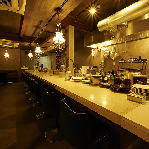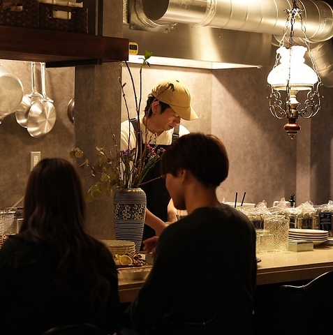 カウンター越しに料理が仕上がる様子を楽しめる、ライブ感のあるお席。会話とお酒が自然と進み、仕事帰りの一杯や気軽なデートにも使いやすい空間です