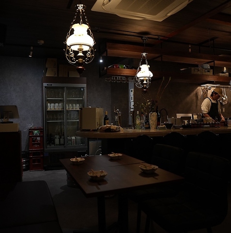 照明を落とした店内は、夜の時間をゆったりと楽しめる大人の雰囲気。料理とワインを味わいながら、日常を忘れてくつろげる空間づくりにこだわっています。