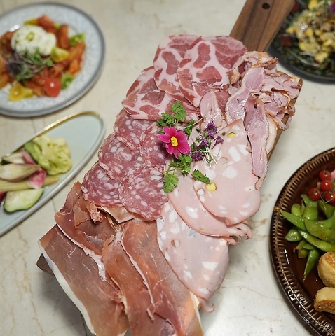 香り・旨味・食感の異なる厳選ハムを贅沢に盛り合わせた一皿。それぞれの個性が引き立つよう厚みや切り方にもこだわりました。まずはそのまま、次にお酒と合わせてお楽しみください。ワインとの相性は抜群で、前菜としてシェアにも最適。食事のスタートを華やかに彩る人気メニューです。