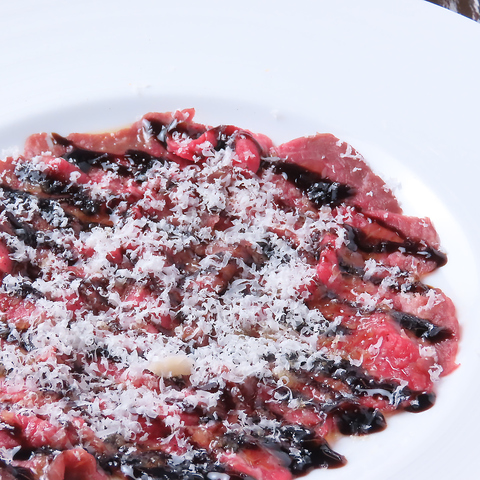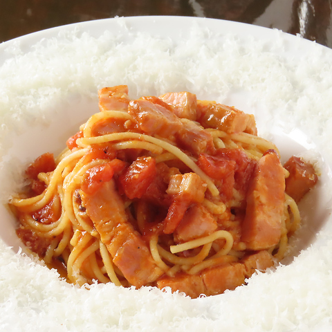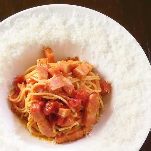 思わず目を奪われるビジュアル。真っ赤なトマトソースを囲むように、皿の縁まで真っ白なパルミジャーノチーズを贅沢に散らし、まるで「雪景色」のような一皿。完熟トマトの爽やかな酸味と、厚切りベーコンの凝縮された旨み。そこに溶け出す濃厚なチーズのコクが重なり、口いっぱいに至福のハーモニーが広がります。