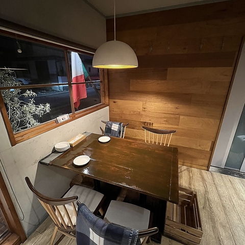 木の温もりに包まれた店内には、少人数でゆったりと寛げる4名様用テーブルを2卓ご用意。店主の感性が光る自由な発想の創作イタリアンを、我が家のようなアットホームな空間で、大切な方と気兼ねなくお楽しみください!