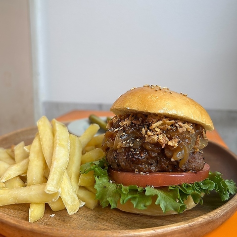 ガッツリ食べたい気分なら「mogu×2バーガー」がおすすめ!国産牛100%のパティを贅沢に2枚使用し、さらに厚切りベーコンとチーズをサンドした、まさに「背徳」という名にふさわしいボリューム感です。溢れ出す肉汁と濃厚なチーズのハーモニーは、一度食べたら忘れられない満足感をお約束します。