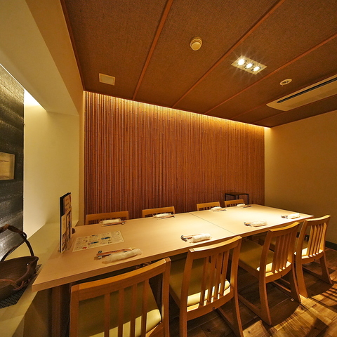 絶妙なタイミングでお食事、お飲物をご提供させて頂きます。人気のカウンター席は横並びにお座りいただけるので、大切な方とのお食事や接待利用にも最適です。臨場感あふれるカウンター席で、四季折々のお料理と地酒を心ゆくまでご堪能ください。