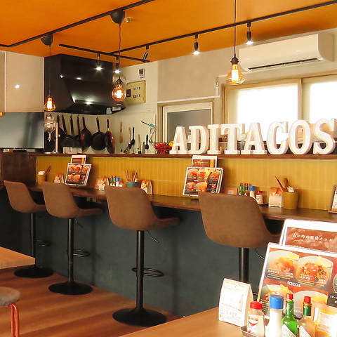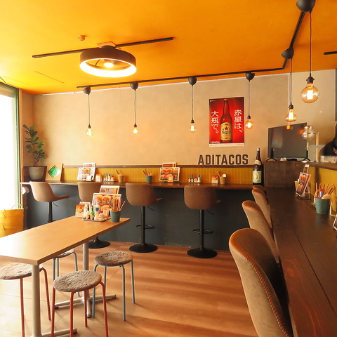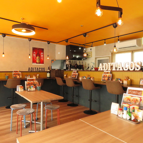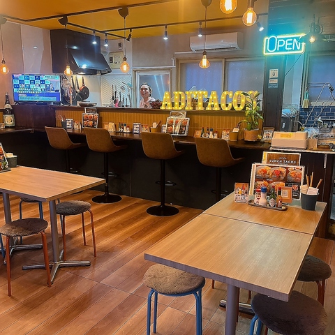 一歩足を踏み入れれば、そこはまるで海外のバルのようなワクワクする空間♪おしゃれな「ADITACOS」の電飾看板やネオンサインが、温かみのある照明に映える自慢の内装です。壁面のポスターや細部にまでこだわった装飾がメキシカンな雰囲気を一層盛り上げます。