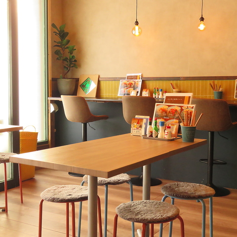 木の温もりが心地よい落ち着いた雰囲気も兼ね備えています。シックな色合いのカウンター席や、開放感のあるテーブル席が並びます。明るいイエローの天井と柔らかなペンダントライトが、賑やかな夜もゆったりとしたランチタイムも素敵に演出します。本場のエッセンスを感じる空間で、至福のタコス体験を