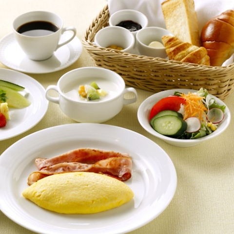 お選びください【ジュース】トマト/オレンジ/グレープフルーツ/豆乳/ミルクより一品【卵料理】フライドエッグ/プレーンオムレツ/スクランブルエッグ/ボイルドエッグ/ポーチドエッグより一品【温料理】ベーコン/ハム/ソーセージより一品 ●サラダ ●ヨーグルト ●フルーツ ●バスケットブレッド ●コーヒー または 紅茶