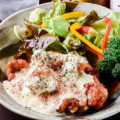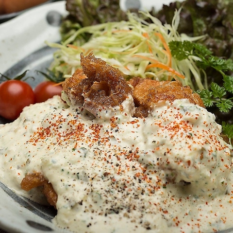 鶏肉の旨味を閉じ込めたチキン南蛮は、濃厚なタルタルソースが美味しさを引き立てます。価格は858円(税込)。友人同士やご家族でシェアして召し上がるのもおすすめです。ぜひ揚げたてをお愉しみください♪