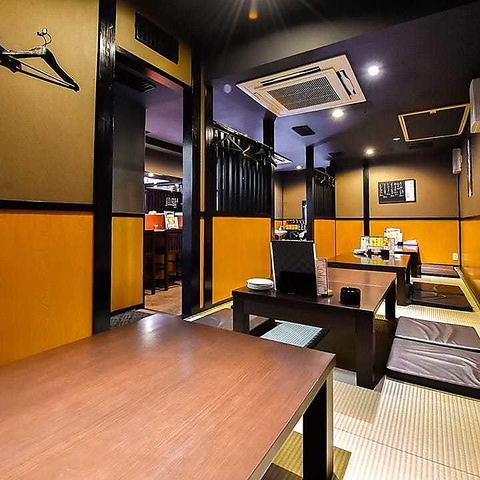 グループでの利用に便利な、お座敷席です。広々としたテーブルで、旬の刺身五種盛りやボリューム満点の地鶏料理をゆったりと堪能できます。全席で喫煙が可能ですので、お煙草を嗜まれる方を含むお集まりでも、移動の必要なくお食事とお酒を心ゆくまでお愉しみいただけます。