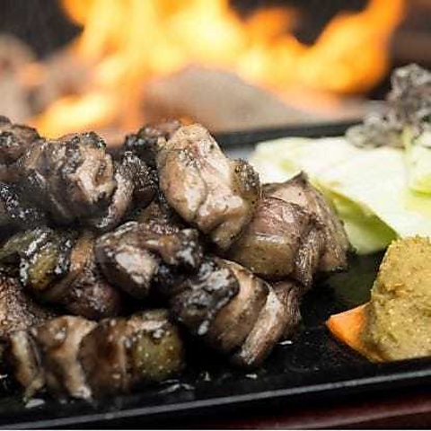 看板メニューのさつま地鶏を豪快に炭火で焼き上げました。炭の香ばしさと地鶏の深い旨味がたまらない一品です。小サイズ(150g)は1,518円(税込)から。お酒のお供に欠かせません。
