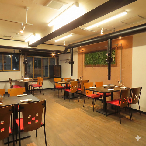 スタイリッシュな空間で過ごす特別なひととき。木目の床とテーブルがやさしい温度を添え、整ったレイアウトが心を落ち着かせてくれます!赤色のクッションチェアが程よい彩りとなり、天井の配管デザインや壁面のグリーンが軽やかなアクセントに◎気負わずゆったりとそた雰囲気の中で料理と会話を楽しめる、スタイリッシュなお店です!