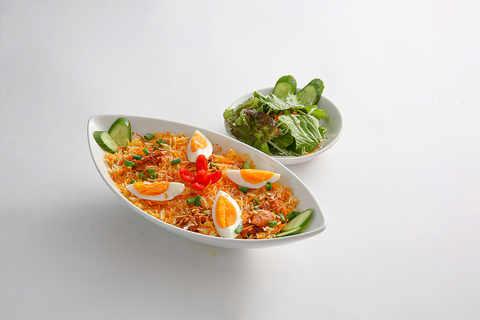 スパイスで味付けしたエビとバスマティライスを炊き込んだ料理。エビの旨味とご飯の風味が調和した一品です。/スパイスで味付けした羊肉とバスマティライスを炊き込んだ料理。マトンの旨味とスパイスが調和した一品です。※サラダ付き