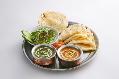 2種類選べるカレー・ミニライス・サラダ・チキンティッカ・パパド・ナンの付いたセットです。