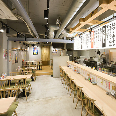 コンクリート調のモダンな壁に温かみのある木製家具が映える、明るく開放的な店内です♪ゆったりとしたテーブル席に加え、一段上がった小上がり席も完備しており、女子会や会社宴会にもぴったり◎壁一面に貼られたメニューを眺めながら、自慢のやきとんを囲んで賑やかに語らう、最高のひとときをお過ごしください★