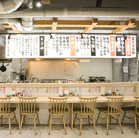 お一人様やデートに大人気のカウンター席は、まさに特等席です◎目の前には「もつ煮込み」や「やきとん」の短冊メニューが並び、厨房からの香ばしい香りが食欲を刺激します★職人が一本ずつ丁寧に手仕込みし、強火で一気に焼き上げるライブ感もご馳走♪スタッフとの会話も楽しみながら、活気ある夜をお過ごしください★