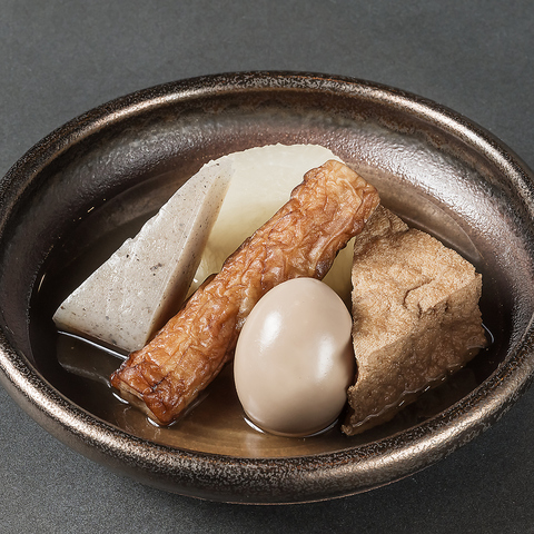 お出汁がしっかり染みた、心温まるおでん。定番のたまごや大根など、いろいろな種類を取り揃えております。お酒の合間にホッとする優しい味です。