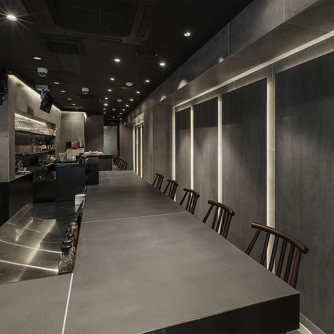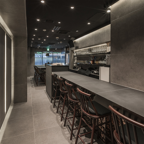 モノトーンの落ち着いたカウンターと個室風ボックス席。一軒目から深夜の二軒目まで、至福のひとときを。