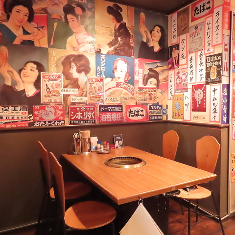 昭和レトロなポスターが壁いっぱいに飾られた、どこか懐かしい雰囲気の焼肉屋さん。テーブル中央のロースターで自分たちで焼きながら、ワイワイ楽しめるスタイルです。木のテーブルとあたたかい照明が居心地よく、友だちや家族との食事にぴったり。香ばしい匂いに包まれながら、おいしいお肉を気軽に楽しめるお店です。