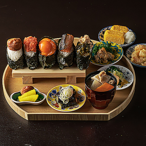 【基本セット 3種1099円(税込)~】釜土炊き立てご飯を、注文ごとにふんわり握るおにぎり。明太子や南高梅、焼き鮭など気分で選べる楽しさ♪日替わり小鉢や天ぷら、出汁巻き玉子を追加して自分好みの御膳にアレンジできます。少しずついろいろ楽しみたい日におすすめ★