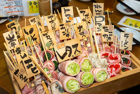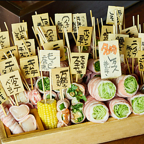 毎朝採れたての新鮮な野菜においしい国産のバラ肉を丁寧にグルグル巻きにして、じっくり、おいしく焼き上げ!。ヘルシーでおいしい野菜まき串をぜひ召し上がれ。野菜巻き串のメニューは別紙にあります。店員まで。