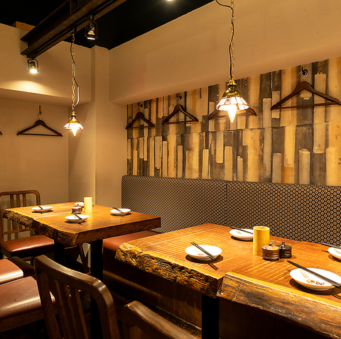 壁面のデザインや木の質感が目を引く、お洒落で開放的なテーブル席。少人数の飲み会から中規模の宴会まで、幅広いシーンでご利用いただけます。落ち着いたトーンの内装は、仕事仲間との打ち上げやカジュアルな会食にもぴったり。美味しい料理とお酒を囲みながらリラックスした時間を共有できます。