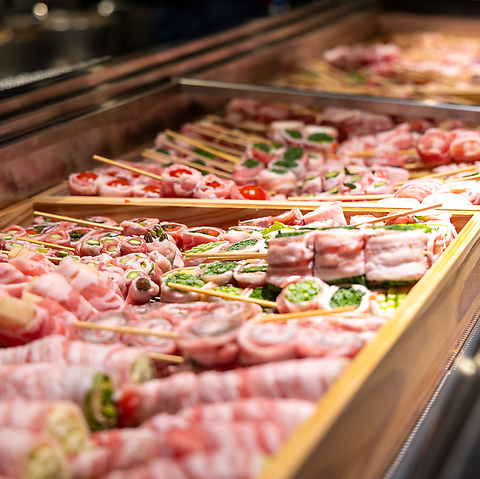 毎朝仕入れる新鮮な野菜を、国産のバラ肉でひとつひとつ丁寧に巻き上げました。炭火でじっくりと焼くことで、外側は香ばしく中はジューシーな仕上がり。ヘルシーでな野菜巻き串は、定番から変わり種まで多彩。盛り合わせもおすすめです。