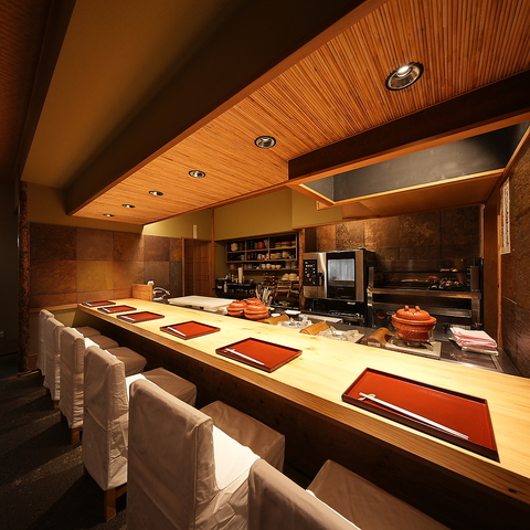 | カウンター | 1名様×6 | 職人の技を目の前で愉しむ「特等席」。選び抜かれた白木が美しいカウンター席は、接待や大切な方との語らいに最適です。職人の鮮やかな包丁さばきや、鍋から立ち上る芳醇な香りを間近でご堪能ください。 |
