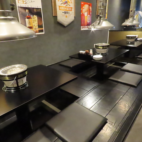 掘りごたつ席でゆったり炭火焼きを満喫。落ち着いた空間で食事と会話を楽しめます。
