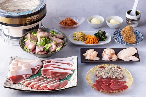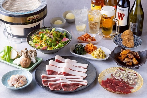 鹿や猪などのジビエをはじめ、鮮度にこだわった地鶏も豊富にご用意。部位ごとの旨みを活かし、七輪でじっくり焼き上げることで素材本来の味わいを堪能できます。野菜や一品料理も揃い、最後まで楽しめる内容です。