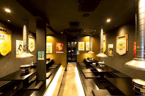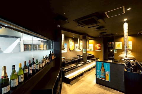 落ち着いた照明に包まれた店内は、七輪を囲んでゆったり過ごせる大人の空間。無煙ロースター完備で、煙や匂いを気にせず食事を楽しめます。カウンター感覚で使える席からグループ利用まで対応し、普段使いから宴会まで幅広く利用可能です。