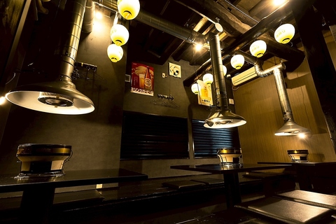 天井に連なる提灯の灯りと、無骨なダクトが印象的な店内。どこか懐かしさを感じる造りが、肩肘張らずに過ごせる心地よさを演出します。七輪を囲む距離感も程よく、仲間と語らいながら食事を楽しめる雰囲気です。