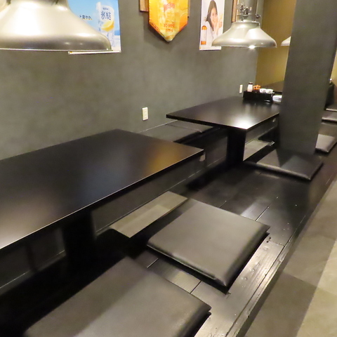 シックな色合いで統一された店内は、落ち着きながらも気取らない居心地の良さが魅力。掘りごたつ席が並び、ゆったり腰を落ち着けて料理を味わえます。友人同士の集まりからグループでの利用まで、リラックスした雰囲気で過ごせる空間です。