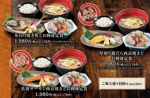 名物のお刺身定食や生本まぐろ入海鮮丼など種類豊富にご用意!数量限定で日替わり定食もあります!