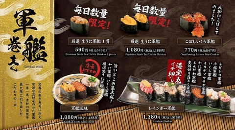 大人気のネギトロ軍艦やえんがわ軍艦、その他毎日数量限定の生うに軍艦もおススメ!