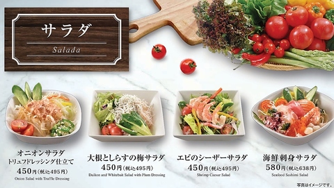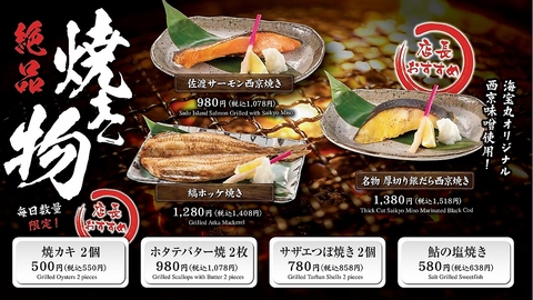 日替わりで近海漁港から直送で仕入れたお魚のお刺身や焼き魚をご用意しております。その他、名物の生カキや焼きカキは産地直送で毎日数量限定で入荷しています♪