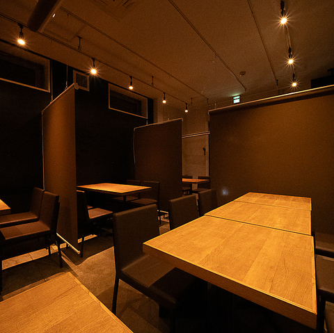 全卓半個室可能!全卓が半個室仕様のプライベート空間。周囲の視線や賑わいを気にせず、落ち着いてお食事をお楽しみいただけます。シックな内装と温かな照明が大人の雰囲気を演出し、デートや友人との食事はもちろん、仕事帰りの一杯や会食にも最適。ゆったり過ごせる安心の半個室ダイニングです。