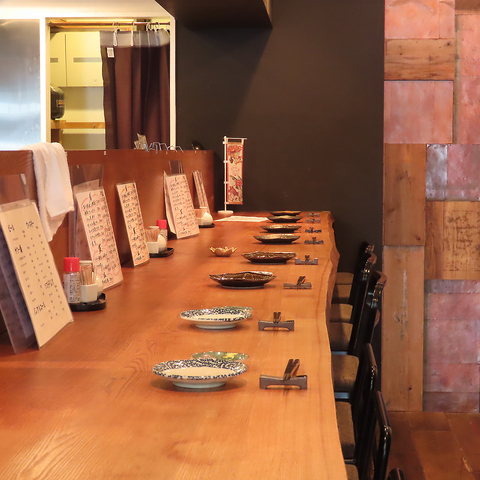 温もりある一枚板カウンターが広がる大人の特等席。落ち着いた灯りの中、料理人の仕事を間近で感じながらゆったりと過ごせる贅沢な空間です。お一人様はもちろん、少人数での食事やしっぽり楽しみたい夜にも最適。木の温もりと程よい距離感が生む心地よい時間をお楽しみください。
